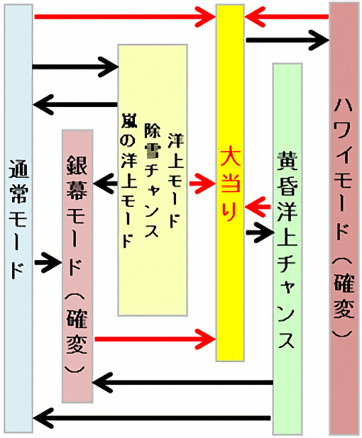 一般的なモード搭載機のフローとなっている。確変期待度の高い「嵐の洋上モード」に移行したらしばらくは様子を見ておきたい。