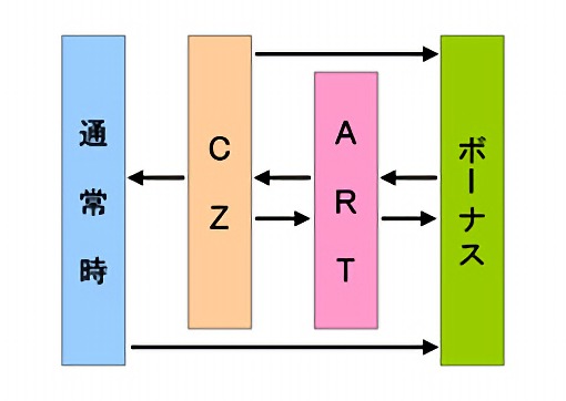 ARTへの突入は必ずボーナスを経由し、また終了時は「リベンジゾーン」というチャンスゾーンへ突入する。