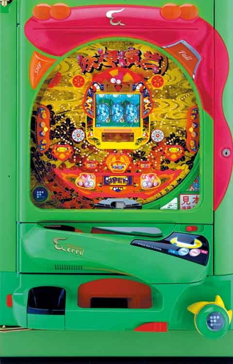 今週のピックアップ! 1999年 8月 27日 第18号 今回は以前にも紹介した機種を取り扱っているが、写真を入手した事と、実際にホールへの導入がはじまってきたこともあり、より実践的な分析をしてみようと思う。 ■CR妖怪演芸FL3&FN(藤商事) とうとう確変率が1/2を超えるCR機が登場、CR妖怪演芸FNだ。1〜12の絵柄12通りのうち、1,3,5,7,9,10,11,12の8通りで確変突入となる。突入、継続、共に2/3となる。確変率が2/3という事は、初当たり1回に対して期待出来る大当たり回数が3回となる。