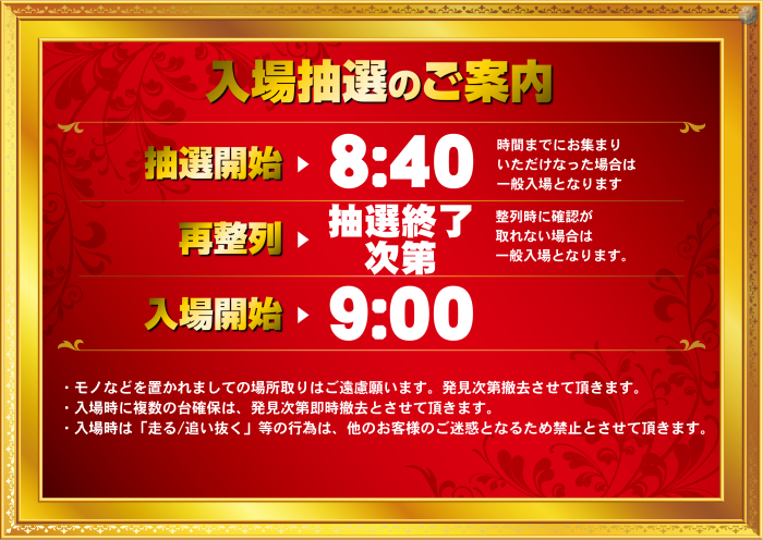 ÃêÁª³«»Ï 8:40¡¢ºÆÀ°Îó ÃêÁª½ªÎ»¼¡Âè¡¢Æþ¾ì³«»Ï 9:00 |