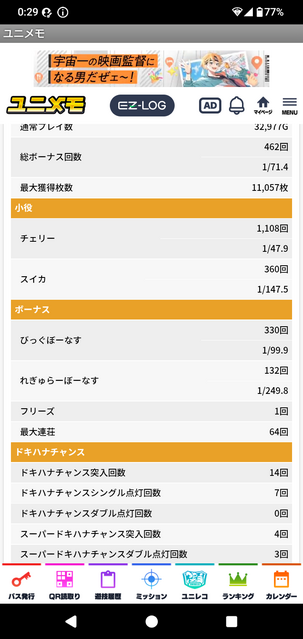 ユニメモを活用した実戦データ分析を重視し、ドキハナモードの昇格条件やのるかなチャンスの挙動について具体的な検証結果を共有。万枚達成の実績も持ち、確定役の確率変化など詳細な情報提供で掲示板に貢献している。