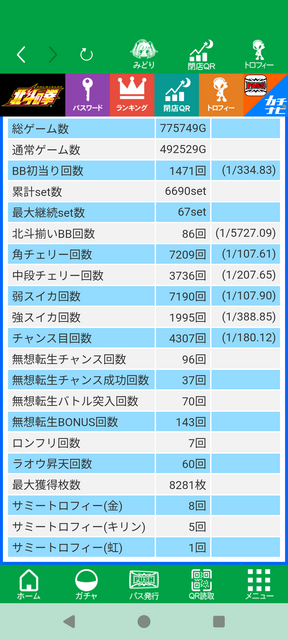- 中チェリーの引けなさが深刻な問題として議論。1800G超のハマりは普通にあり、過去には6000Gハマりの報告も。設定1で約1/210の確率だが青天井のため、引けない時は本当に引けないとの声が多数。マイスロデータで中チェ0回の記録を持つユーザーもおり、パチンコの199なら恐ろしくて打てないとの意見も。