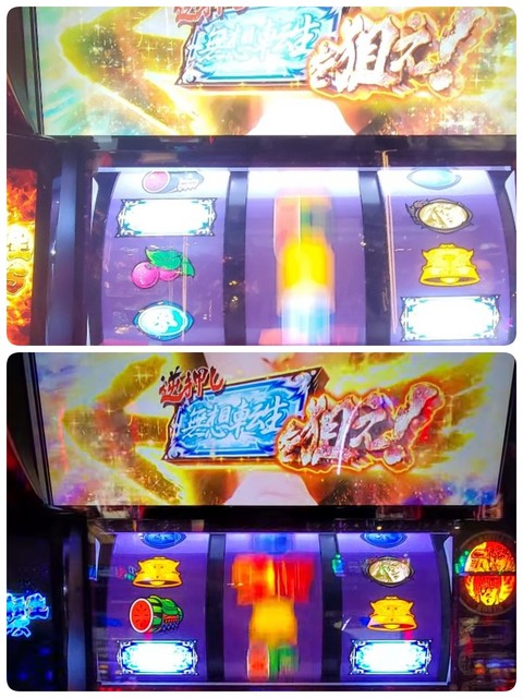 中リール中段7から、右リールは上段7、これは無想転生図柄が下段まで滑って特定役!と思ったら2チェでした。