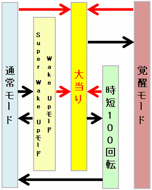 通常時は常に確変潜伏の可能性があり、「Wake Upモード」「Super Wake Upモード」などのチャンスモードへ移行することで更に潜伏確変の可能性がUPする。