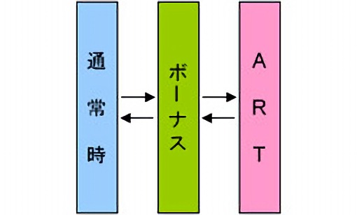 - ボーナス間1080Gハマリで、次回ボーナス後のART突入が確定、また通常時を1460GハマるとARTに突入しボーナス成立まで継続する。