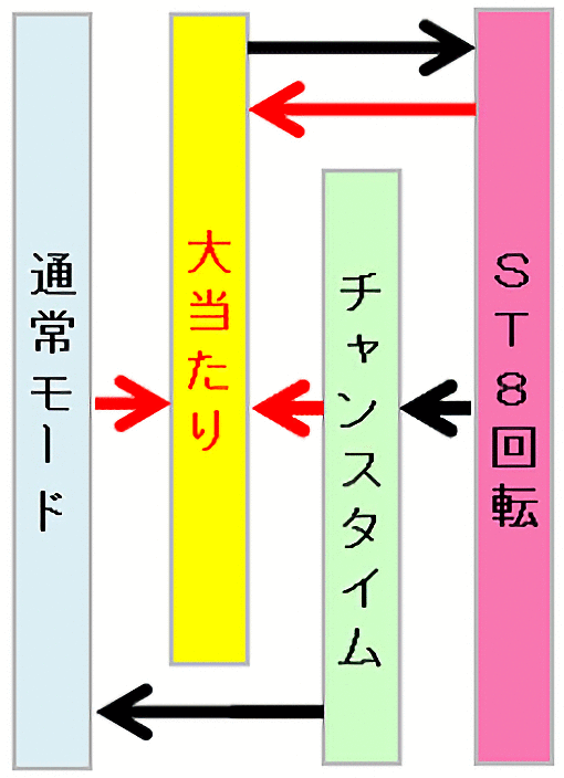 全ての大当り終了後には8回転のST(回数切り確変)に突入し、ST終了後は42回転の時短に移行する。
