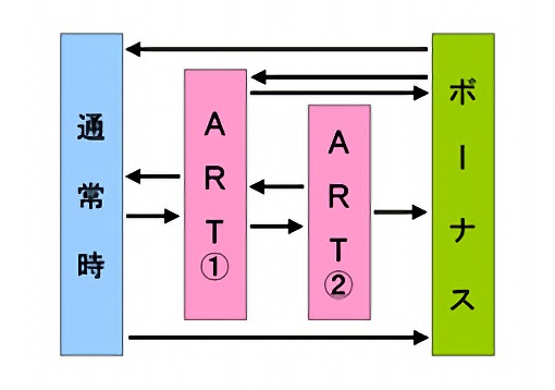 本機には「ぱちんこゾーン(ART①)」と「黄門ちゃんす(ART②)」という2種類のARTがあり、通常ゲーム、ボーナス経由を問わずART②突入は必ずART①を経由する流れだ。また、天井状態からのART突入時も、最初はART①を経由する。