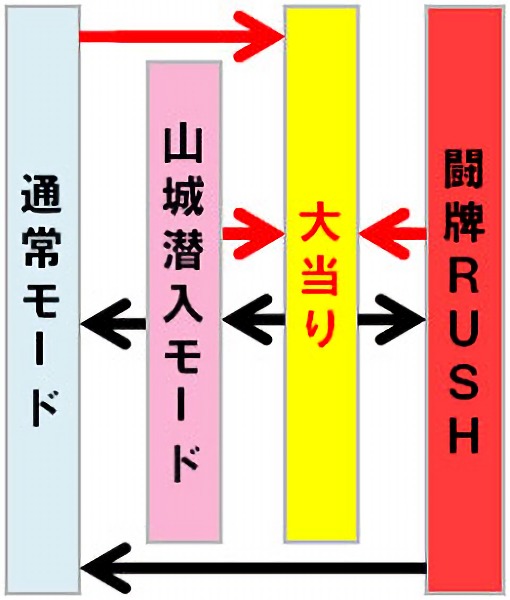 勝利すれば「闘牌RUSH」へ突入、敗北した場合は80回転の電サポなしST「山城潜入モード」へ突入する。