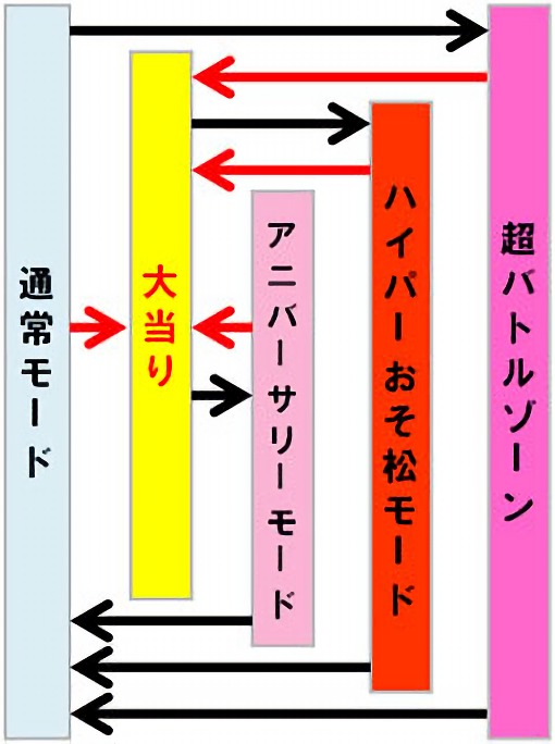 先に登場した他スペックと異なり、本スペックはST(回数切り確変)となっており、電サポ付きST10回転+時短90回転の「ハイパーおそ松モード」へ突入することが出玉のカギとなる。