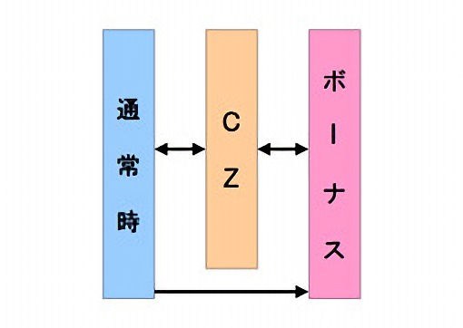 擬似ボーナスは通常時とチャンスゾーンから突入し、擬似ボーナス終了後はチャンスゾーンへ突入する。