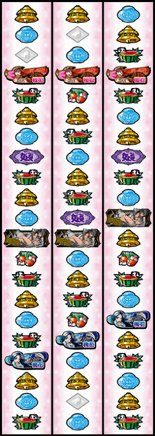 - 1ゲーム約2.8枚純増のベルナビ回数管理型ATによる擬似ボーナスを搭載。「桃花ボーナス」はベルナビ20回で終了し、純増枚数は約100枚。「桜花ボーナス」はベルナビ40回で終了し、純増枚数は約200枚。「娘娘ボーナス」はベルナビ60~222回で終了し、純増枚数は約300~1110枚。