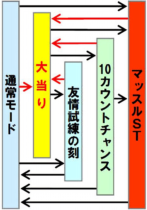 6Rチャンス大当りで、ラウンド中の特訓に成功した場合は「マッスルST」へ突入、失敗した場合は特殊演出モードの「友情試練の刻」へ突入する。