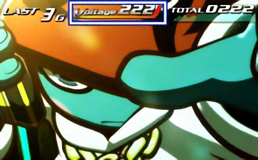 「VOLTAGE」規定ポイントまでの距離を示唆。背景色は「青<緑<赤」の順で期待度アップ。