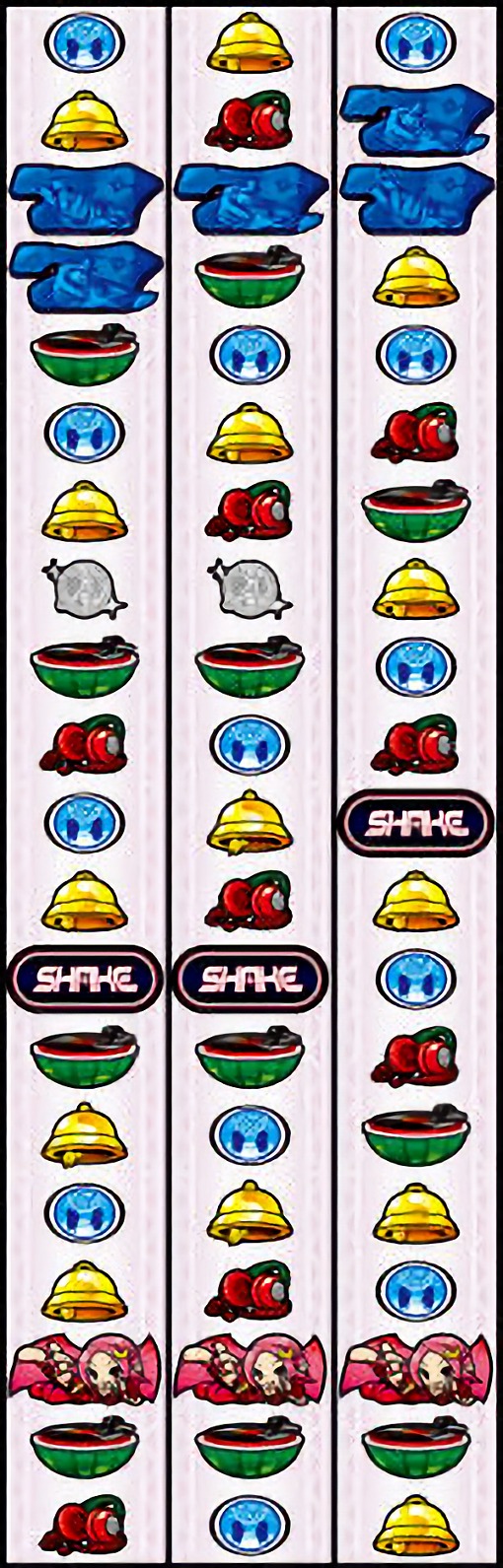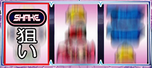 カットイン発生時は逆押しで青7図柄を狙い、揃えば「SHAKE BONUS(VVIP)」獲得。色は「青<赤<虹」の順に期待度アップ。