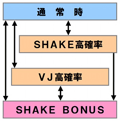 擬似ボーナス「SHAKE BONUS(VVIP)」は、通常時や前兆ステージ「SHAKE高確率」、自力高確率「VJ高確率」から突入する。