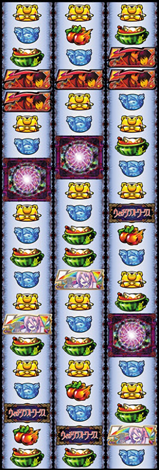 通常時は「NeXTチャンス」突入で次回周期抽選までのゲーム数が表示され、減算特化ゾーン「ウィッチライブ」「絆リンク」突入で周期ゲーム数多数減算の大チャンス! 擬似ボーナスのチャンスゾーンは前兆タイプ「ケモミミハントタイム」「工房の魔女集結」「クライマックスバトル」、自力タイプ「拷問チャンス」の4種類。