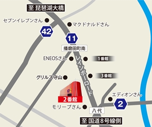 琵琶湖大橋とりつけ道路沿い近江バス新八代下車2分 【店舗地図】